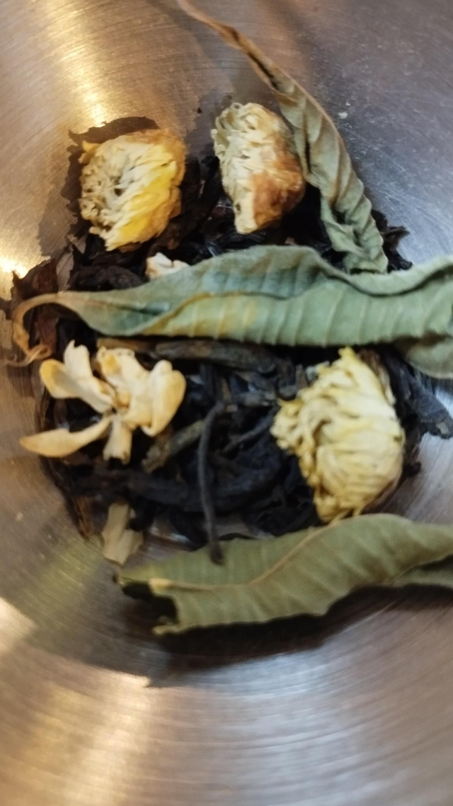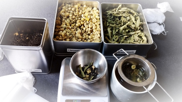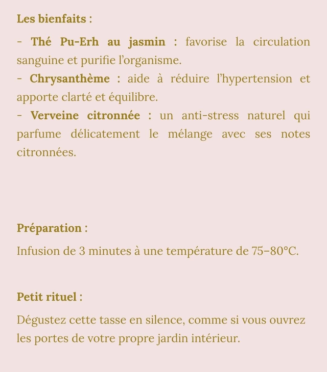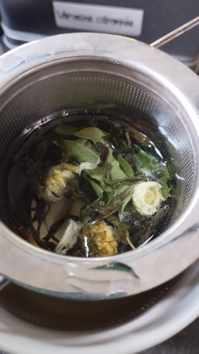 Thé au jasmin, fleurs de chrisanthème et verveine citronnée.