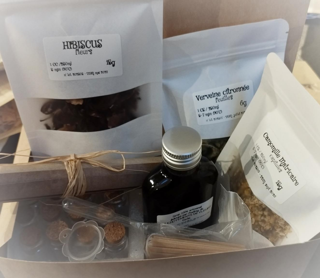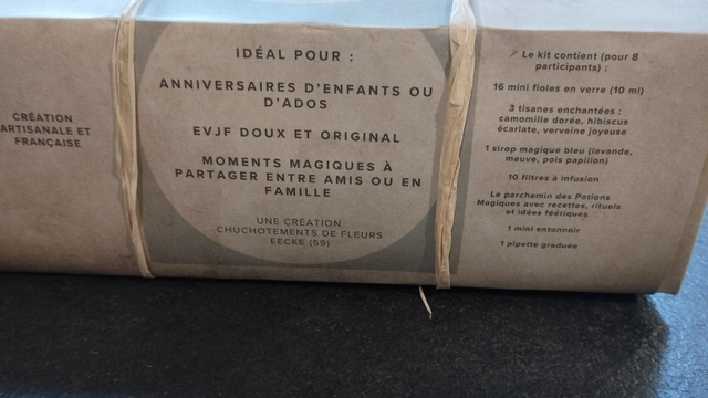 Imaginé par Audrey de Chuchotements de Fleurs, ce coffret vous invite à créer de véritables potions naturelles à base de plantes, d’infusions colorées et d’un sirop magique bleu…