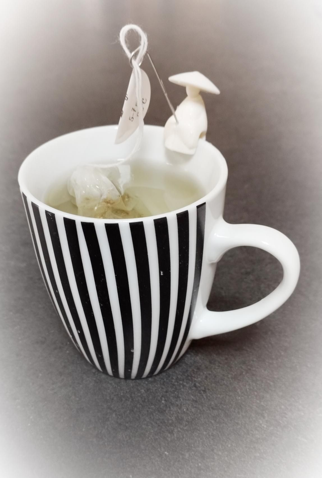 Inspiré d'une vielle légende chinoise : Jiang Taigong utilisait une canne à pêche avec hameçon sans appât. Il croyait que le poisson viendrait à lui, quand il serait prêt. Maintenant il peut patiemment tenir votre sachet de thé pendant qu'il infuse.